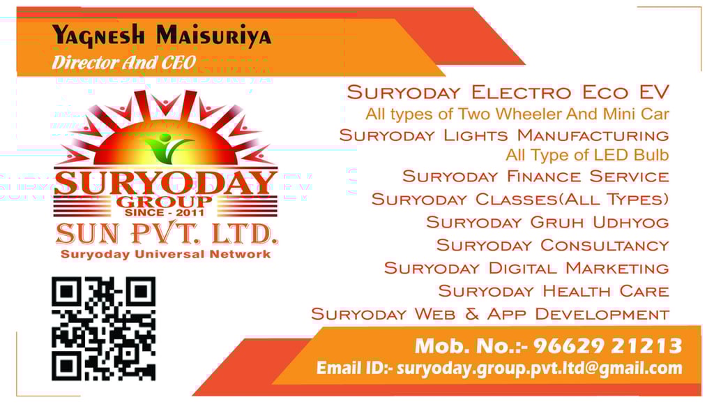 Suryoday Group is a national group of India, headquartered in Navsari. Mr. Yagnesh Maisuriya founded this group in 2011 and did social service work in the social sector. Over time, the economic condition of the society and rising youth unemployment were seen as a major challenge in the country. At present it has been decided to set up new industries to provide employment to the youth to solve this problem and to improve the economic problems of many families in the society.