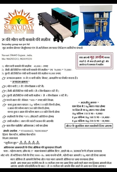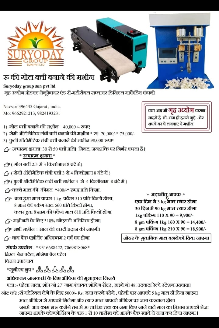 Cotton Wicki machine Round cotton machine With buy back guarantee agreement Round Cotton Wicks Making Machine by Suryoday Gruh Udyog. Suryoday Gruh Udyog is thrilled to unveil our latest innovation, the Round Cotton Wicks Making Machine. This state-of-the-art machine is designed to cater to the growing demand for round-shaped cotton wicks, offering unmatched efficiency, precision, and ease of use for the cotton wick manufacturing industry. Unparalleled Efficiency and Productivity: The Round Cotton Wicks Making Machine is engineered to optimize production efficiency, ensuring maximum output and productivity. With advanced technology and innovative features, this machine streamlines the manufacturing process, allowing you to produce a large quantity of round cotton wicks within a short period of time. Say goodbye to time-consuming manual labor and embrace the efficiency of our cutting-edge machine.