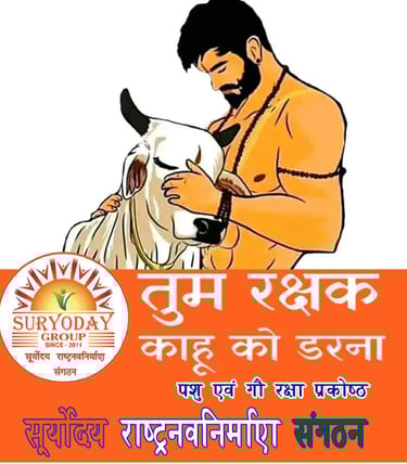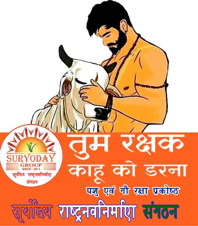 पशु एवं गौ रक्षा प्रकोष्ठ के माध्यम से सूर्योदय ग्रुप गायो की सेवा के लिए कार्य कर रहे है और काफी सारी विभिन्न प्रकार की योजनाऐ बनाकर गायों को अच्छी परवरिश और सुविधा प्रदान कर रहे हैं और साथ ही गौ रक्षा हेतु सभी गौ रक्षको को और गौ प्रेमी को एक साथ जुड़ कर गौ माता को राष्ट्र माता का दर्जा दिलाने हेतु अभियान चला रहे है। आये हम सब मिलकर उनके इस भागीरथी कार्य में सहभागी बने। गौ रक्षक बनने हेतु निचे दिए गए लिंक पे क्लीक करे और आपका सहयोग प्रदान करे।